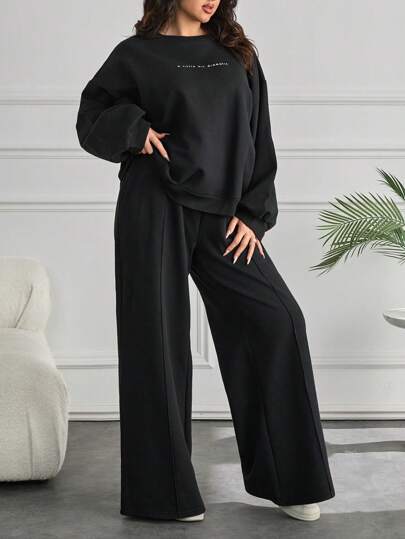 RueChic SLEEVE CUT DETAIL SLOGANED SWEATSHIRT AND WIDE LEG PANTS - Black - View 1