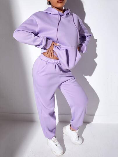 SHEIN SXY Kangaroo Pocket Drawstring Hoodie & Joggers - Lilac Purple - View 1