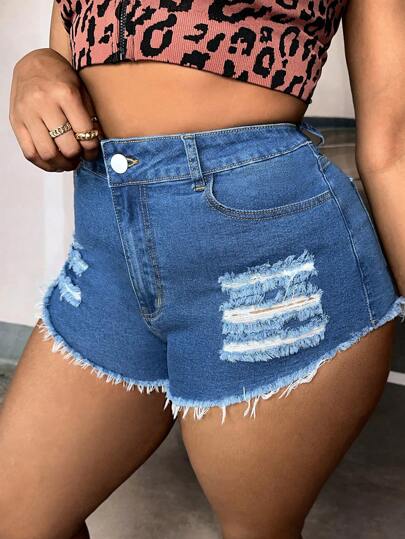 SHEIN SXY Plus Ripped Raw Hem Denim Shorts - Medium Wash - View 1