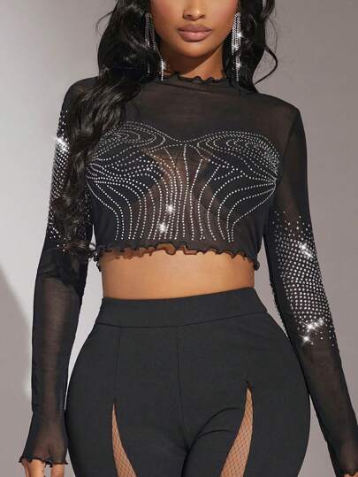 SHEIN SXY Rhinestone Detail Lettuce Trim Crop Mesh Top Without Bra - Black - View 1