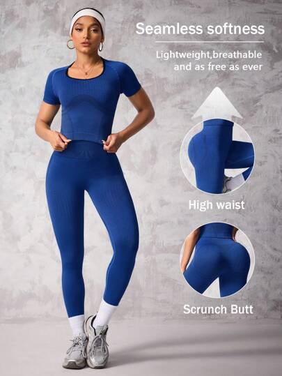 Easithlete Blue Solid Color Short Sleeve Top & Long Pants Set, Casual & Stylish For Everyday Wear - Blue - View 2