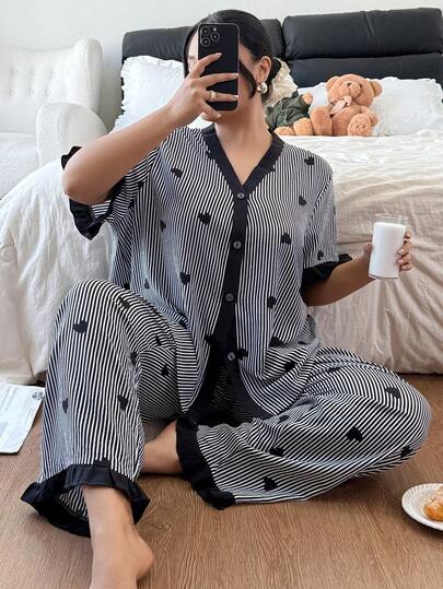 SHEIN Striped Heart Print Color Block Plus Size Pajama Set - Multicolor - View 1