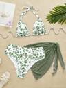 Swim Mod Women's Summer Beach Ditsy Floral Halter Neck Tie Bikini Swimwear Set With Cover-Up Skirt, 3 Pieces Bathing Suits