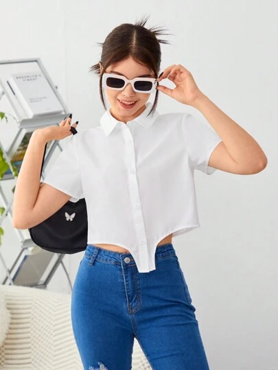 SHEIN Teen Girl Woven Plain Color Short Sleeve Shirt With Rounded Hemline And Button Front - White - View 1