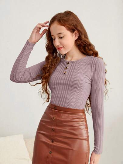 SHEIN Leap Crew Teen Girls Button Front Rib-knit Tee - Dusty Pink - View 1