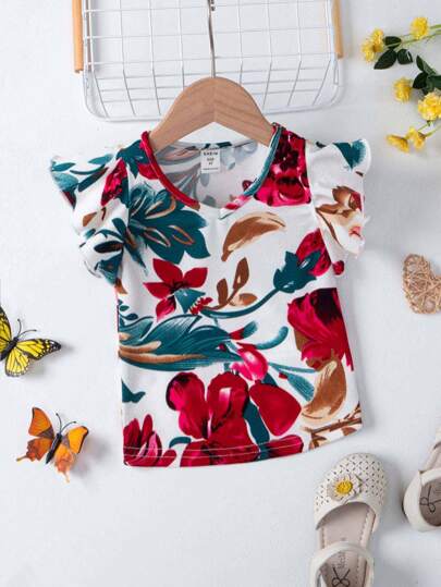 SHEIN Toddler Girls Tropical Print Ruffle Trim Tee - Multicolor - View 1