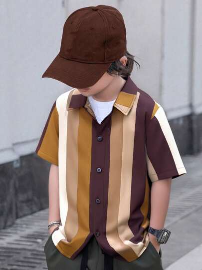 SHEIN Tween Boy Casual Striped Print Pattern Turndown Collar Button-Up Short Sleeve Woven Shirt - Multicolor - View 1