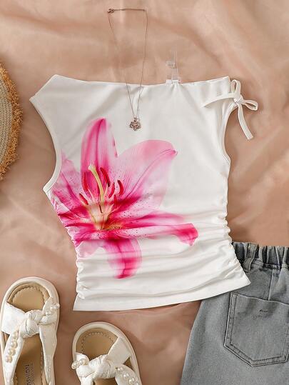 SHEIN Tween Girls' Casual Elegant Floral Print Asymmetrical Shoulder Ruched Cropped T-Shirt - White - View 1