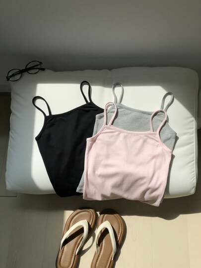 SHEIN 3pcs/Pack Tween Girls Casual Multicolor Knit Camisole Top, School, Campus, College - Pink - View 1
