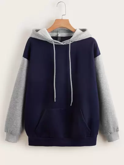 SHEIN Two Tone Drop Shoulder Thermal Hoodie - Navy Blue - View 1
