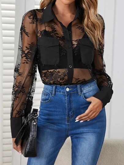SHEIN Privé Flap Pocket Lace Shirt Without Bra - Black - View 1
