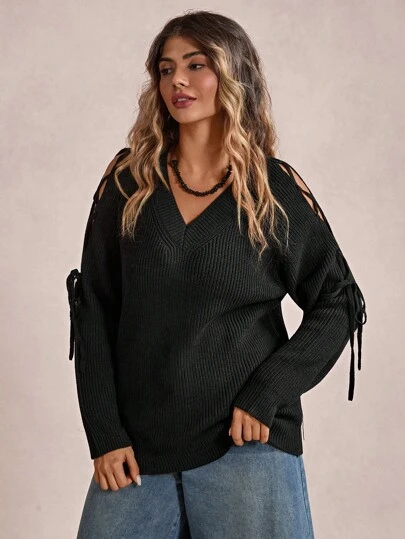 SHEIN VCAY Plus Lace Up Side Raglan Sleeve Sweater - Black - View 1