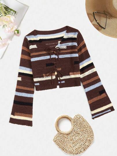 SHEIN VCAY Striped Pattern Knot Front Cardigan - Multicolor - View 1
