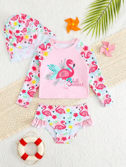 SHEIN Young Girl Camisole Bikini Top With Printed Pattern, Bottom With Random Digital Printing, Flared Unbound Hem + Hat - Multicolor - View 3