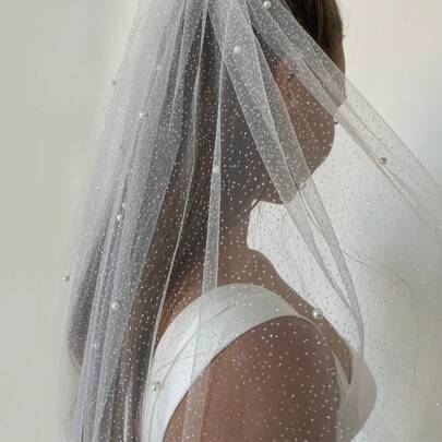 1pc Ultra-Thin Polka Dot Mesh Bridal Wedding Dress Accessory, Featuring Faux Pearl Decor, Elegant Wrap Strapless With Trailing Sleeves, Adjustable Bust Size, Suitable For All Seasons