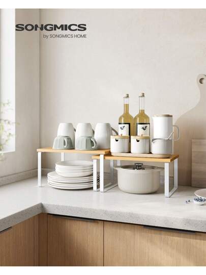 SONGMICS Spice Rack, Set Of 2 Cupboard Shelf Organiser, Expandable Kitchen Shelf Organiser, Stackable Spice Holder, Metal And Engineered Wood, White And Natural - Yellow - View 1