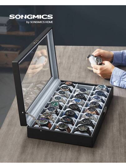 SONGMICS Watch Box, Lockable Watch Case, Watch Storage Box With 24 Slots, Glass Lid, Gift For Loved Ones, Black Synthetic Leather, Grey Lining - Black - View 1
