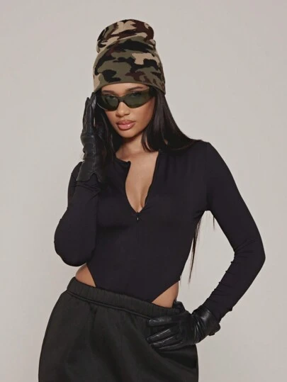 SUMWON WOMEN Second Skin Long Sleeve Bodysuit Invisible Zip Closure Form Fitting Fall Winter Layering Base Essential Fitted Glam Streetwear - Black - View 1
