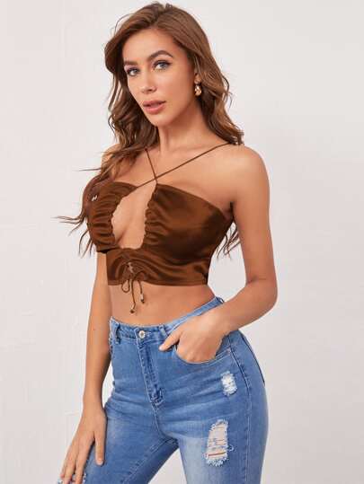 Satin Tie Front Peekaboo Cami Top - Coffee Brown - View 1