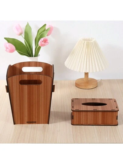 Set Of Wooden Desktop Trash Can And Tissue Box, DIY Assembly And Disassembly Household Desktop Supplies Kits, Suitable For Home, Office, Desktops - Brown - View 1