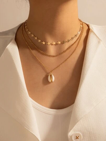 Shell Pendant Layered Necklace - Yellow Gold - View 5