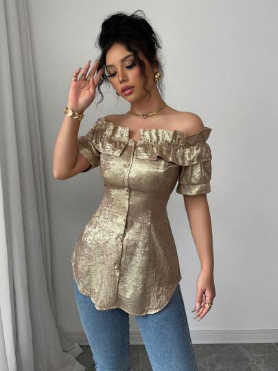 Chiquease Silver Foil Solid Color Ruffle Off Shoulder Short Sleeve Blouse - Gold - View 1