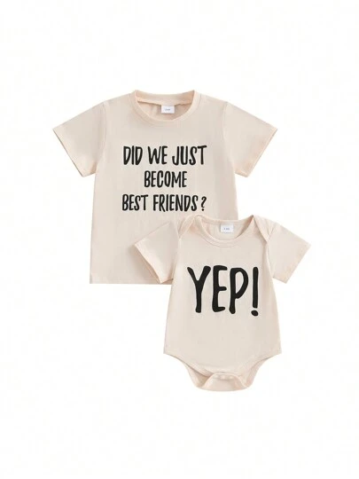 Sister Brother Matching Outfits Letter Print Short Sleeve Round Neck T-Shirt/Romper Sibling Tops - Khaki - View 1