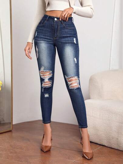 Slant Pocket Ripped Skinny Jeans - Blue - View 1