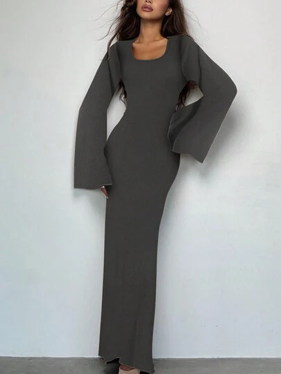 Women Casual Round Neck Bodycon Long Flare Sleeves Back Tie Elegant Daily Street Fall Winter Long Dress - Dark Grey - View 1