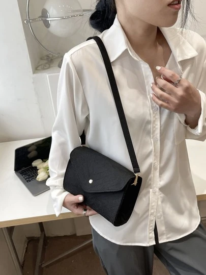 Fashionable Crossbody Bag For Women, Faux Line Crimping Rhombus Grid Felt Fabric - Black - View 1