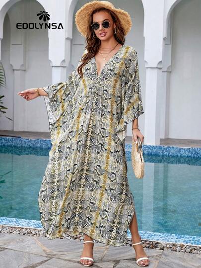 Snake Print Split Hem Kaftan Beach Dress - Multicolor - View 1