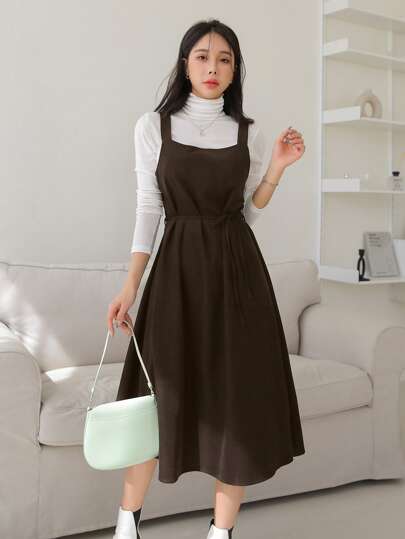 DAZY Solid Belted Pinafore Dress Without Top - Coffee Brown - View 1