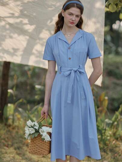 Simple Retro Solid Belted Shirt Dress - Baby Blue - View 1