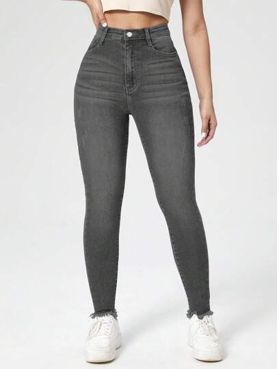 Solid Color Frayed Hem Denim Jeans - Dark Grey - View 1
