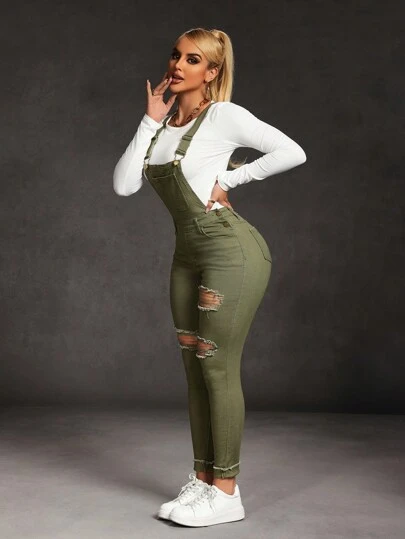 SHEIN SXY Solid Color Ripped Pocket Skinny Sleeveless Jumpsuits With Thick Spaghetti Straps - Army Green - View 1