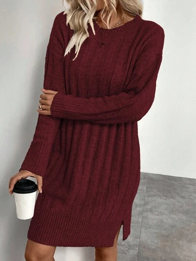 SHEIN LUNE Solid Color Round Neck Long Sleeve Casual Slit Sweater Dress - Burgundy - View 1