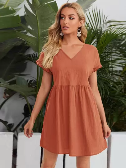 SHEIN Solid Flounce Sleeve Smock Dress - Rust Brown - View 1
