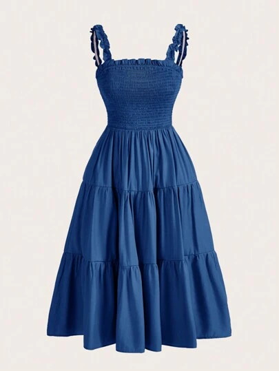 Aveloria Rosie Solid Frill Trim Ruffle Hem Dress Holiday Party Dress  Boho Vacation Fashionable Style For Summer Spring Fall Autumn - Blue - View 1