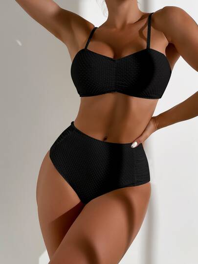 Solid High Waisted Summer Beach Bikini Set - Black - View 1