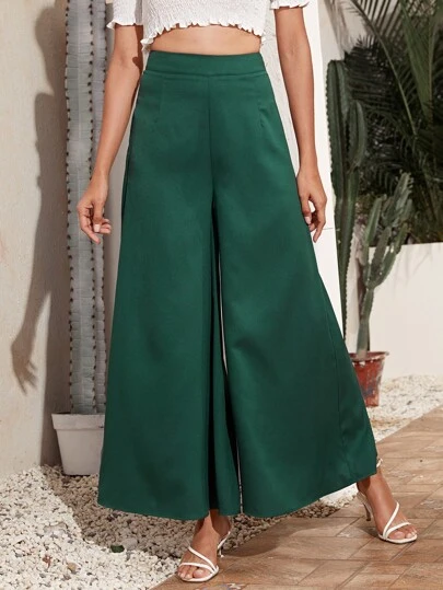 Solid High-rise Culottes Trousers - Dark Green - View 1