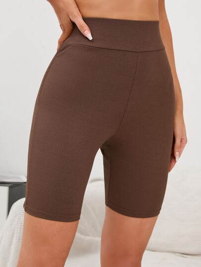 Solid Rib Knit High Waist Cycling Shorts - Chocolate Brown - View 1