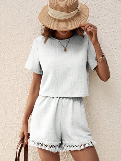 SHEIN LUNE Solid Tee & Tassel Trim Shorts - White - View 1