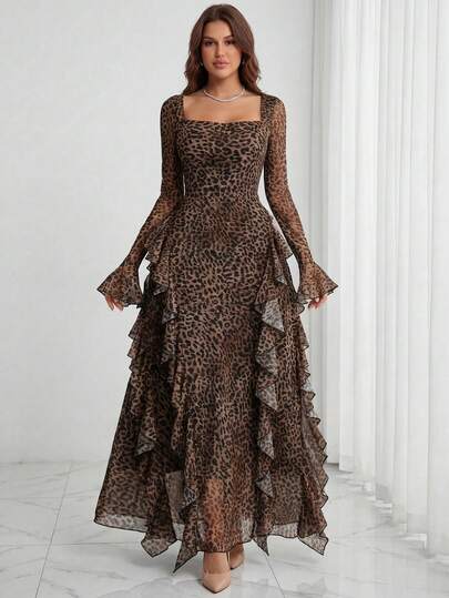 Solstice Apparel Plus Size Leopard Print Side Layered Ruffle Long Sleeve Square Neck Dress, Sheer Mesh Waist Cinched Flared Maxi Dress, Perfect For Commute, Gatherings, Parties, Dates & Dinners, Fall Winter Outfit - Brown - View 1