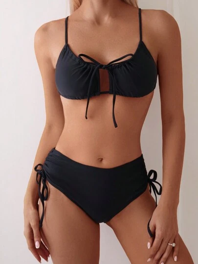 Spaghetti Strap Tie Front High Waisted Black Bikini Set Summer Beach - Black - View 1