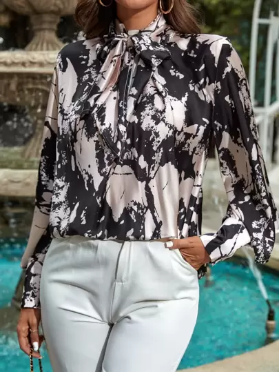 Splash Ink Print Tie Neck Bishop Sleeve Blouse - Multicolor - View 1