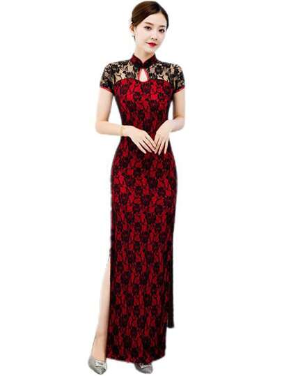 Fikoo Split Thigh Lace Overlay Cheongsam Chinese Dress - Black - View 1