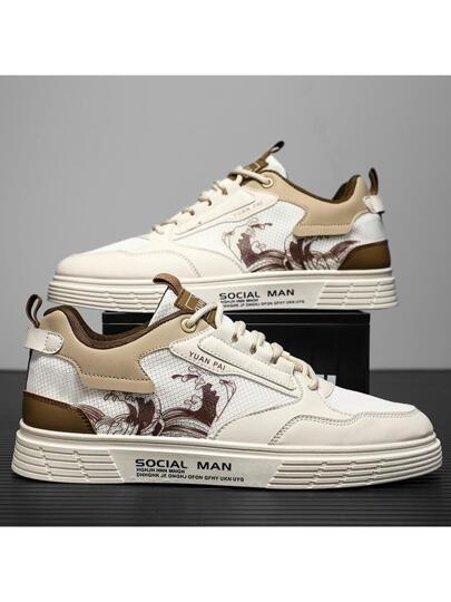 Sporty Sneakers For Men, Colorblock Lace-up Front Skate Shoes - Khaki - View 1