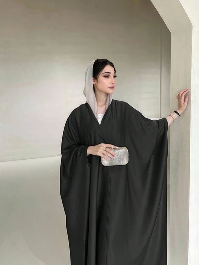 Women's Solid Color Elegant Fashionable Lightweight Batwing Sleeve Open Front Abaya Robe With Belt - No Headscarf, Quick Ship - Black - View 1