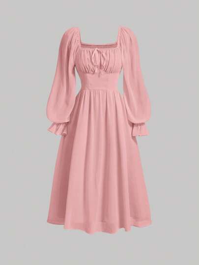 SHEIN MOD Square Neck Flounce Sleeve Ruched Bust Dress - Pink - View 1