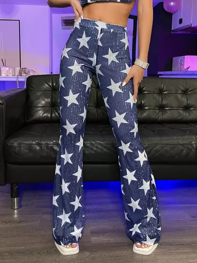 SHEIN ICON Star Print Flare Leg Trousers - Blue and White - View 1